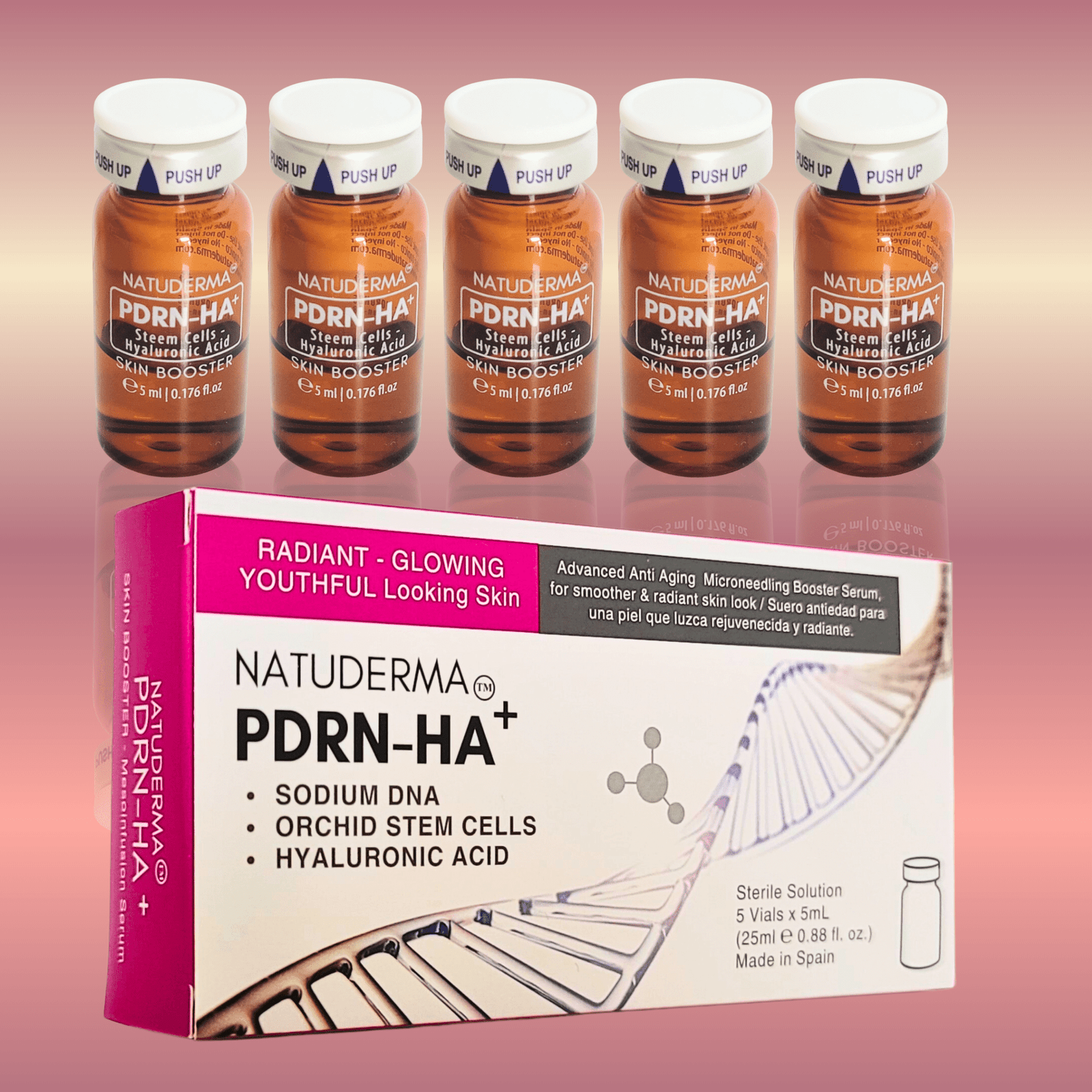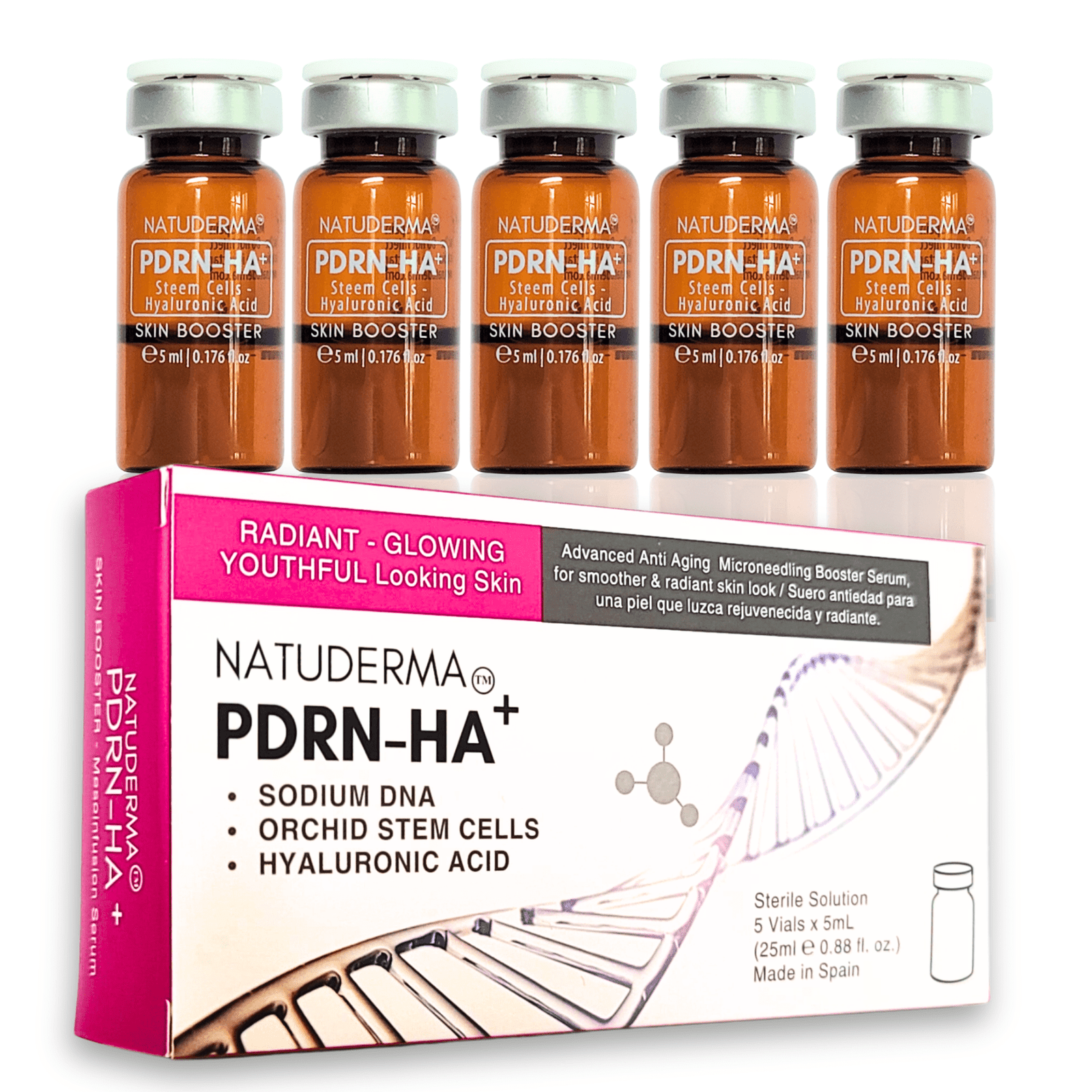 Experience the PDRN-HA microneedling mesotherapy solution, one of our best Hyaluronic acid serum with stem cells for microneedling, and enjoy all its skin benefits. Made in Spain, 5 vials of 5 ml.