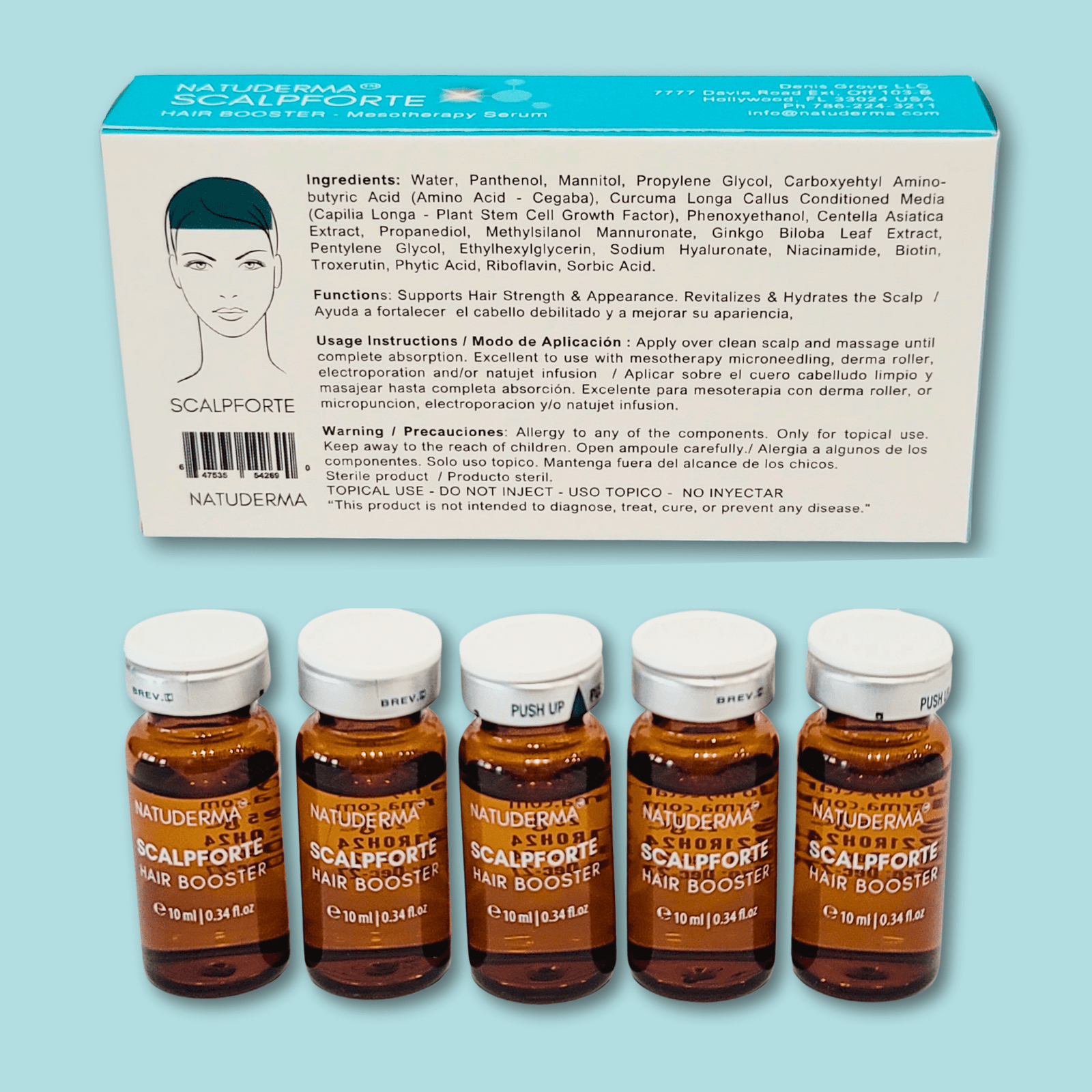 The Scalpforte Exosomes Korean formula contains Capillum Longa™ Phyto-Stem Cell Exosomes with Growth Factors, Essential Amino Acids, Biotin, Panthenol, and a blend of Vitamins and Botanical Extracts. Its innovative composition helps hydrate and revitalize the scalp, promoting a healthier-looking environment for hair. Designed to support scalp and hair care, it helps improve the appearance of thinning hair and enhances the scalp’s condition. Ideal for complementing aesthetic procedures and compatible with mesotherapy and microneedling techniques.